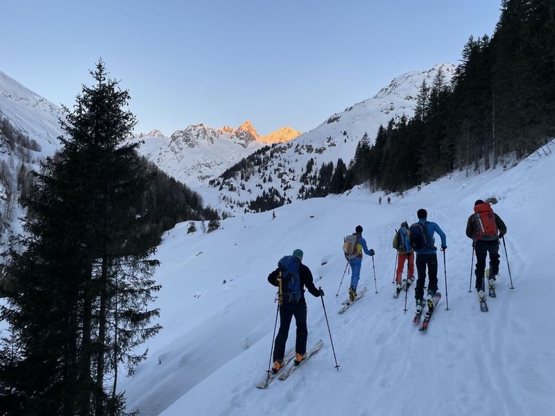 Bei Tagesanbruch kamen wir im Meiental am Winterende der Sustenpassstrasse auf der Urnerseite an und starteten bei schöner Morgenstimmung. Dani hatte in der Tourenausschreibung geschrieben, dass wir bis zum Gipfel auf 3009m ca. 4½ Stunden für die 1450 Höhenmeter haben würden: Und in der Tat war die Angabe sehr präzise: Vier Stunden Aufstieg zuerst durch den Wald, weiter über schöne Hänge inklusive zwei Steilpassagen gegen den Bächenstock und dann noch etwa eine halbe Stunde Kletterei mit Steigeisen zum Gipfel – wobei die an einer steilen Stelle installierten Fixseile durchaus willkommen waren. Auf dem Gipfel die versprochene Rundsicht von Titlis bis Tessin. Für einen Februartag war das Wetter äusserst warm: So genossen wir den Schweiss im Aufstieg, die Wärme bei den Pausen und zuletzt eine lange Frühlingsabfahrt im Sulzschnee. Und am Schluss fanden wir noch eine offene Besenbeiz mit Take Away und (in Uri geöffneter) Terrasse um den Durst zu löschen. Eine wunderbare Tour, danke Dani.