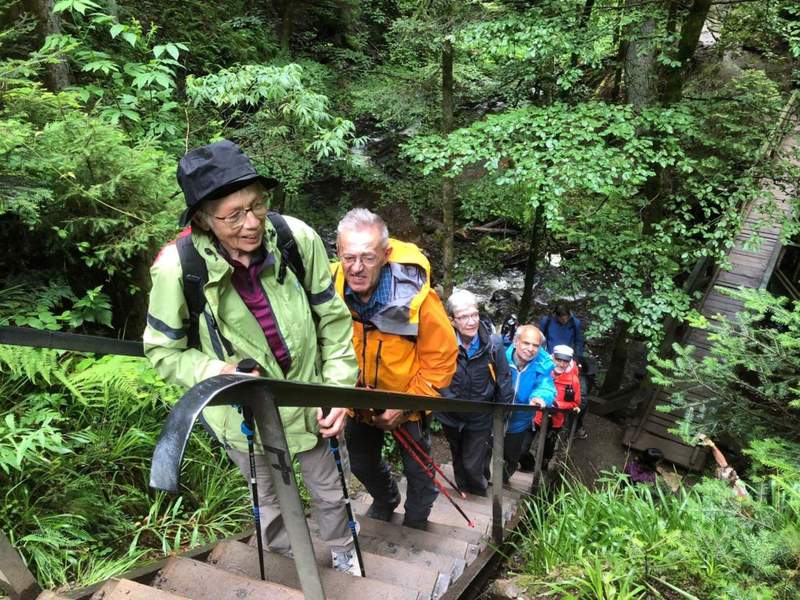 Nach dem Essen haben wir Zeit, um einen Blick in die Glas-Manufaktur zu werfen und einem Glasbläser zuzuschauen. Es hat leicht zu regnen angefangen, Regenjacken und -hüte sind angesagt. Um 13.15 Uhr marschieren wir los in Richtung Ravennaschlucht. Unter dem imposanten Viadukt der Höllentalbahn wird noch ein Gruppenfoto aufgenommen. Dann geht es steil die Schlucht hinauf, stellenweise über Treppen. Einige Male überqueren wir den Bach, die Ravenna. Wir fragen uns, woher der Name kommt.* Weiter oben wird der Weg flacher, und um 14 Uhr erreichen wir das Plateau. Auf einem geteerten Weg marschieren wir zurück nach Hinterzarten. Es regnet etwas stärker, so dass auch noch die Regenschirme zum Einsatz kommen. Eine halbe Stunde später sind wir zurück bei den Autos. Nach einem Zvieri im Hotel Schwarzwälderhof fahren wir zurück nach Brugg, wo wir kurz nach 17 Uhr eintreffen.